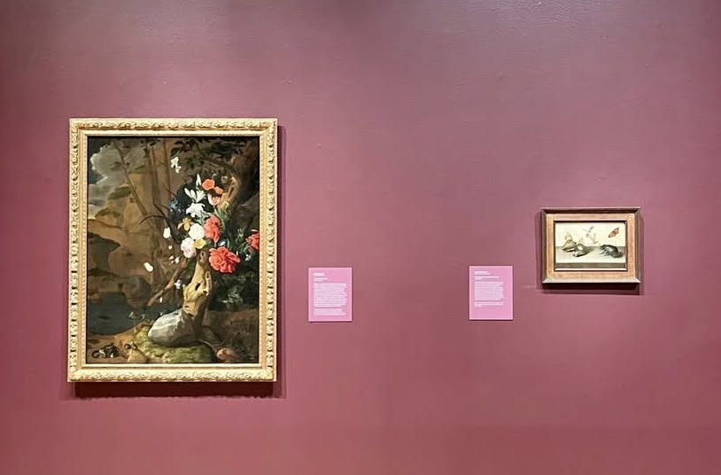 The scale of the show is intimate; it features 17 objects by 14 women artists. The gold-framed oil paintings and watercolors are hung to good effect on mulberry-colored walls. There is also one large-format printed book—a second edition of Maria Sibylla Merian‘s Dissertation in Insect Generation and Metamorphosis in Suriname—in a glass-enclosed floor case. The majority of the artworks on display are from the seventeenth century. An “epilogue” of five works from later periods illustrates women’s ongoing contribution to the evolution of the still life genre.
