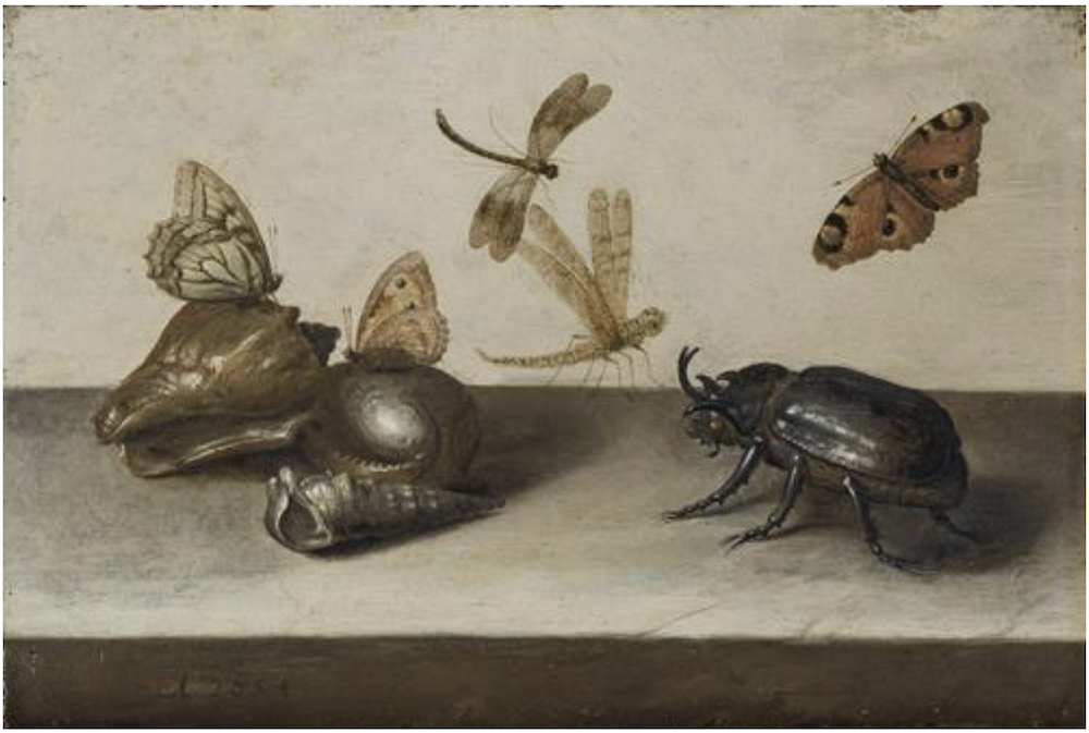 Most of the works on display reflect the show’s title: they feature flowers, or fruit (and sometimes vegetables), or both. But there are a couple of exceptions. In Still Life with Crab, Shrimps, and Lobster, by Clara Peeters, the artist depicts a rich assortment of foods—including eggs, baked goods, and cheese as well as the specific seafoods named in the title—on a beautifully appointed table or sideboard. And Margaretha de Heer’s small, delicate painting Still Life with Insects and Shells seems as much a natural history illustration as an artwork.
