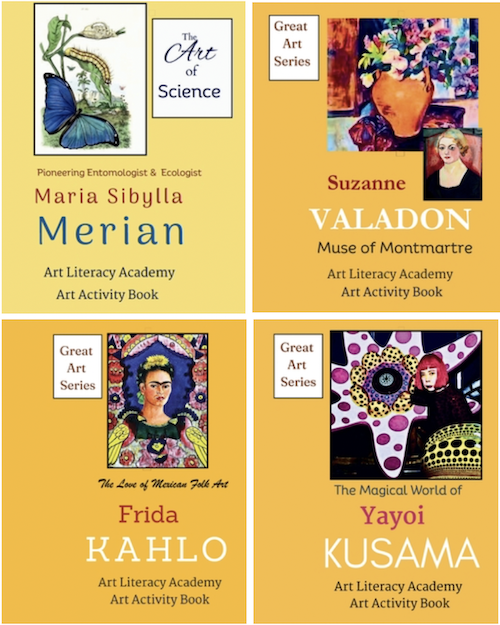 Maria Sibylla Merian: Pioneering Entomologist and Ecologist, Suzanne Valadon: Muse of Montmartre, Frida Kahlo: The Love of Mexican Folk Art, and The Magical World of Yayoi Kusama, by Serene Greene. Publisher: Art Literacy Academy, 2025.
